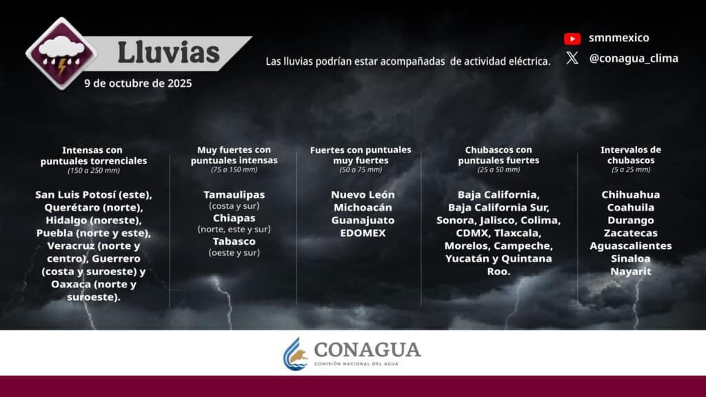Pronóstico de lluvias para hoy 09 de octubre de 2025: