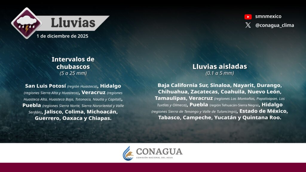 Pronóstico de lluvias para hoy 01 de diciembre de 2025: