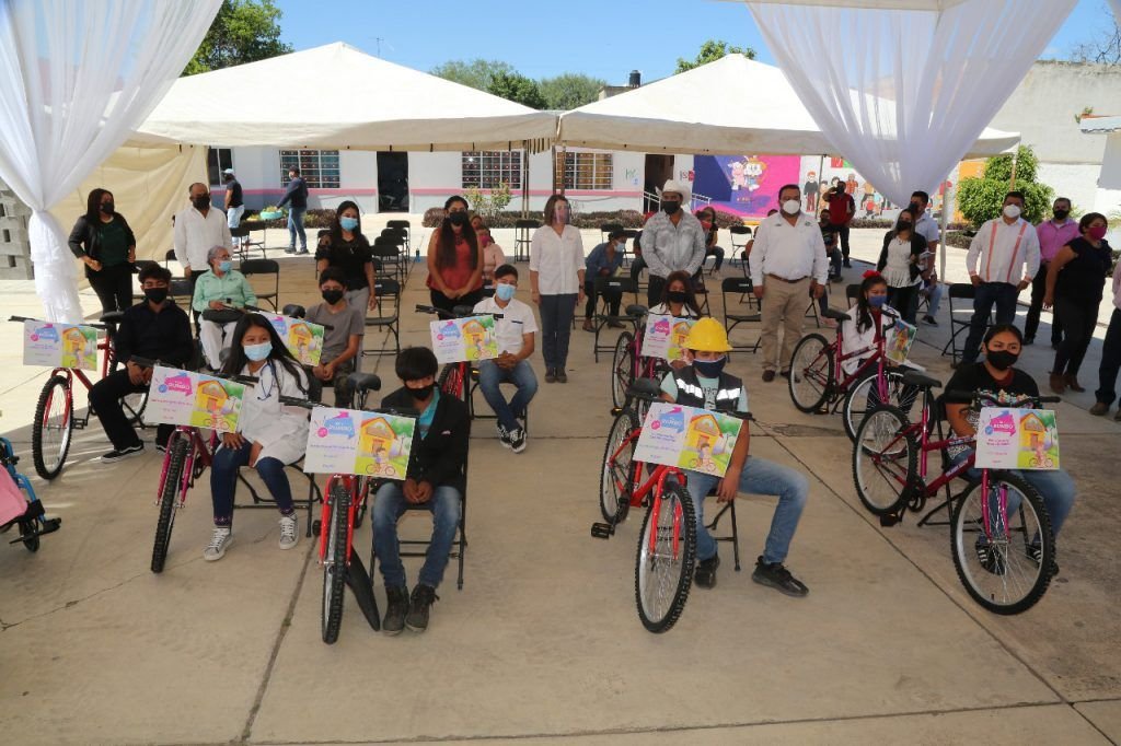 Más adelante, en la localidad Puente del Carmen de Rioverde, la Presidenta de la Junta Directiva acompañada por el Voluntariado de la Oficina Regional 4, también entregó bicicletas a estudiantes de la Escuela Secundaria 74, Secundaria Federal Benito Juárez y Telesecundaria Plan de Ayala.