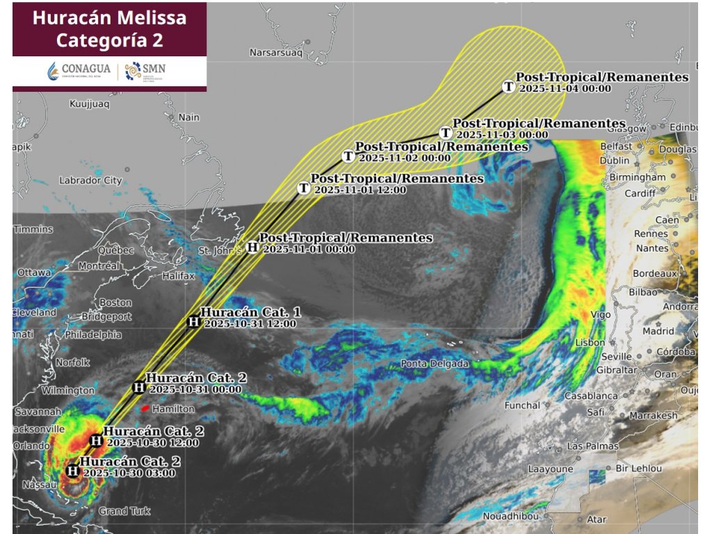 Melissa se dirige ahora a Bermudas como huracán de categoría 2, donde no tocará tierra, pero provocará ráfagas repentinas de fuertes vientos y lluvias intensas a partir de la tarde del jueves.