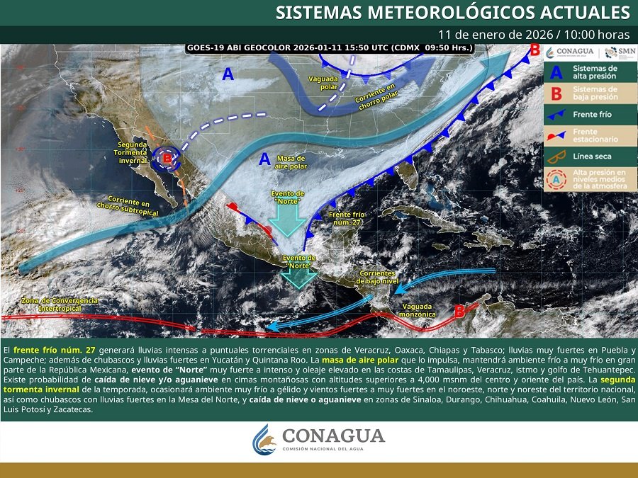 La masa de aire polar asociada al frente mantendrá el ambiente frío a muy frío en la mayor parte de la República Mexicana, densos bancos de niebla en el noreste, centro y oriente del país, así como el evento de “Norte” muy fuerte a intenso y oleaje elevado en las costas de Tamaulipas, Veracruz, istmo y golfo de Tehuantepec.