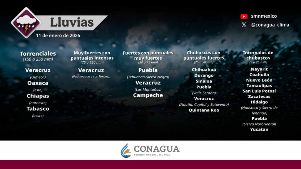 Lluvias intensas con puntuales torrenciales (150 a 250 mm): Veracruz (Olmeca), Oaxaca (este), Chiapas (noroeste) y Tabasco (oeste).