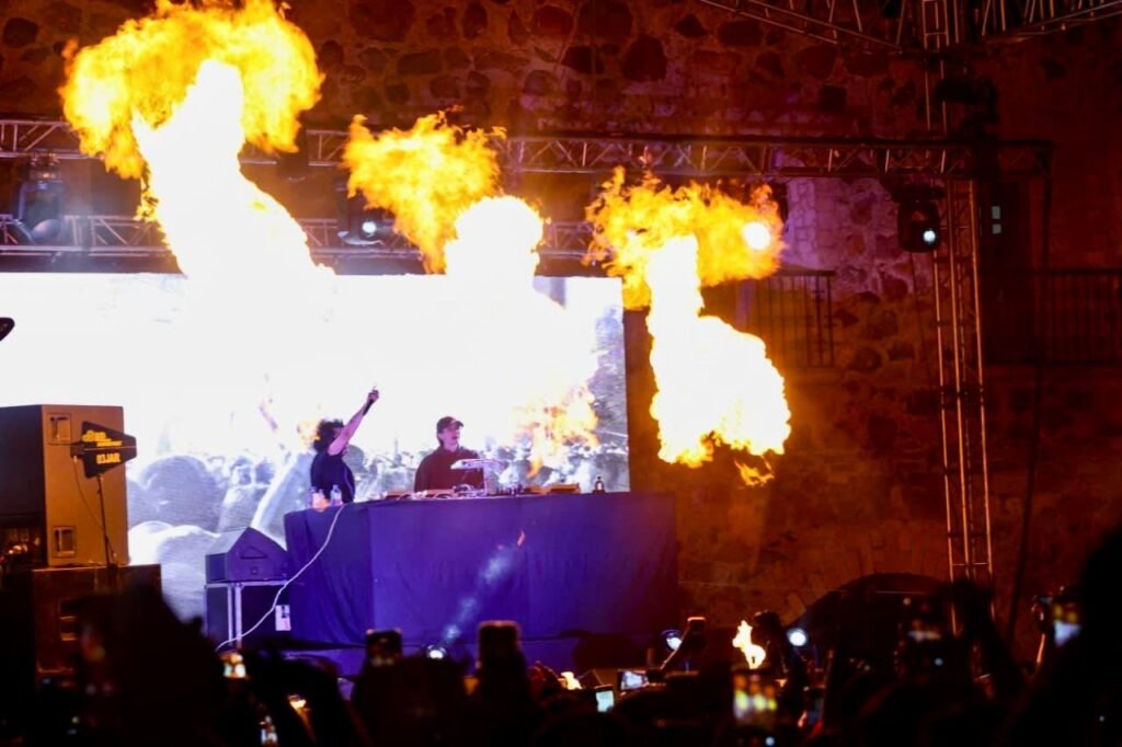 Más tarde, el dúo Røz, integrado por Manolo Cabrera y Hugo Lara, tomó el control del escenario con una mezcla de electrónica y urbano. Sus mashups imprimieron un pulso constante que mantuvo a la plaza en movimiento y elevó la energía colectiva.