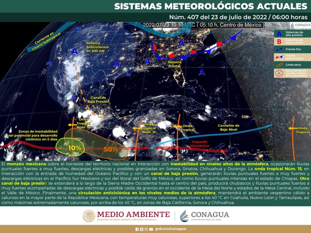 Para hoy, el monzón mexicano permanecerá sobre el noroeste del territorio nacional e interaccionará con inestabilidad en niveles altos de la atmósfera, lo que ocasionará lluvias puntuales fuertes a muy fuertes, descargas eléctricas y posibles granizadas en Sonora, Sinaloa, Chihuahua y Durango. Por otra parte, la onda tropical Núm. 15 que se desplazará sobre Chiapas y Oaxaca, en interacción con la entrada de humedad del Océano Pacífico y con un canal de baja presión que se ubicará sobre la Sonda de Campeche, generarán lluvias puntuales fuertes a muy fuertes y descargas eléctricas en el Pacífico Sur Mexicano y sur del litoral del Golfo de México, así como lluvias puntuales intensas en el estado de Chiapas. Otro canal de baja presión se extenderá a lo largo de la Sierra Madre Occidental hasta el centro del país, producirá chubascos y lluvias puntuales fuertes a muy fuertes acompañadas de descargas eléctricas y posible caída de granizo en el occidente de la Mesa del Norte y estados de la Mesa Central, incluido el Valle de México. Finalmente, una circulación anticiclónica en los niveles medios de la atmósfera, mantendrá el ambiente vespertino cálido a caluroso en la mayor parte de la República Mexicana, con temperaturas muy calurosas, superiores a los 40 °C en Coahuila, Nuevo León y Tamaulipas, así como máximas extremadamente calurosas, por arriba de los 45 °C, en zonas de Baja California, Sonora y Chihuahua.