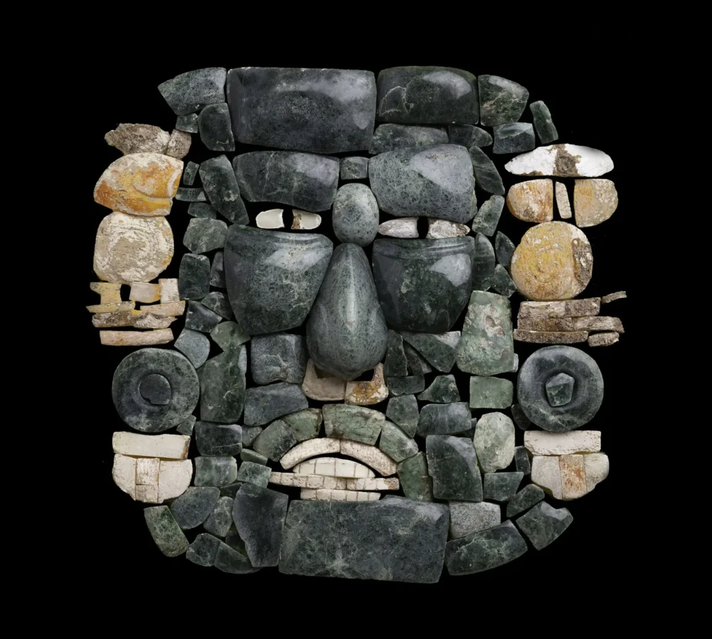 Dentro de la tumba cubierta de cinabrio, los investigadores encontraron una máscara mortuoria de mosaico destrozada hecha de jade y conchas, pendientes de jade y los huesos de un anciano cuyo cráneo había rodado hasta caer dentro de un recipiente de cerámica.