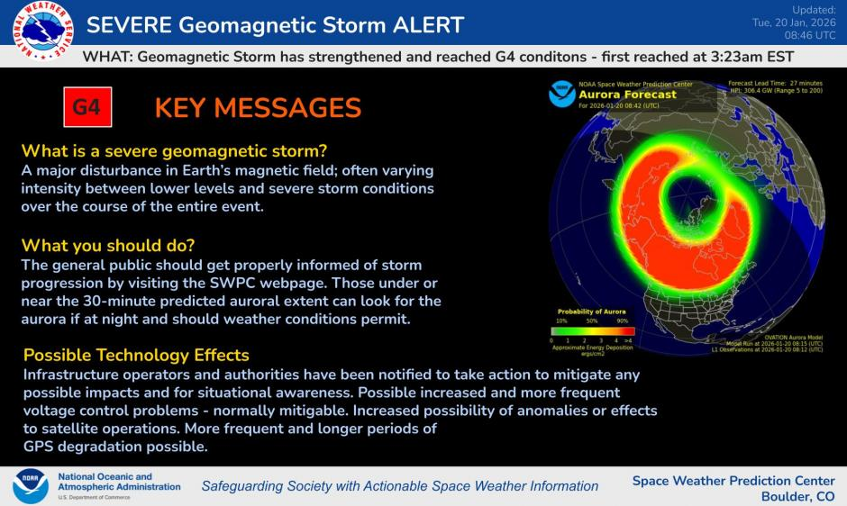 Según el Centro de Predicción del Clima Espacial de la NOAA, el fenómeno alcanzó durante la madrugada del martes el nivel G4 (severo), el segundo más alto dentro de la escala de tormentas geomagnéticas, que va de G1 (menor) a G5 (extrema). Posteriormente, el organismo redujo la alerta a un nivel moderado, de acuerdo con su boletín más reciente.
