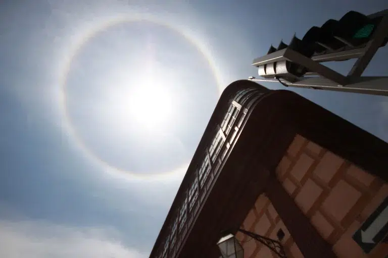 Lo primero a mencionar es que se trata de un fenómeno que se produce a causa de la luz del Sol que atraviesa unos diminutos cristales de hielo que “se encuentran suspendidos en la parte alta de nuestra atmósfera”, de acuerdo al Instituto Geofísico del Perú. Esto ocasiona que la luz solar se disperse de manera peculiar, formando un aro de colores alrededor del cuerpo luminoso que es similar al arcoíris.
