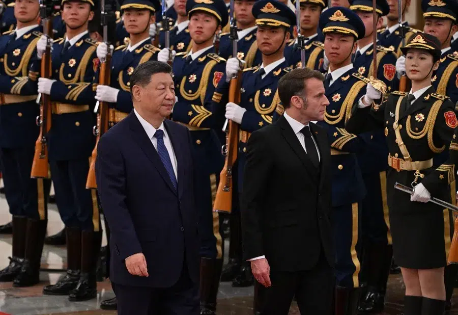 A su llegada, Macron fue recibido con una ceremonia oficial en el Gran Palacio del Pueblo de la capital china antes de iniciar las conversaciones formales con Xi.