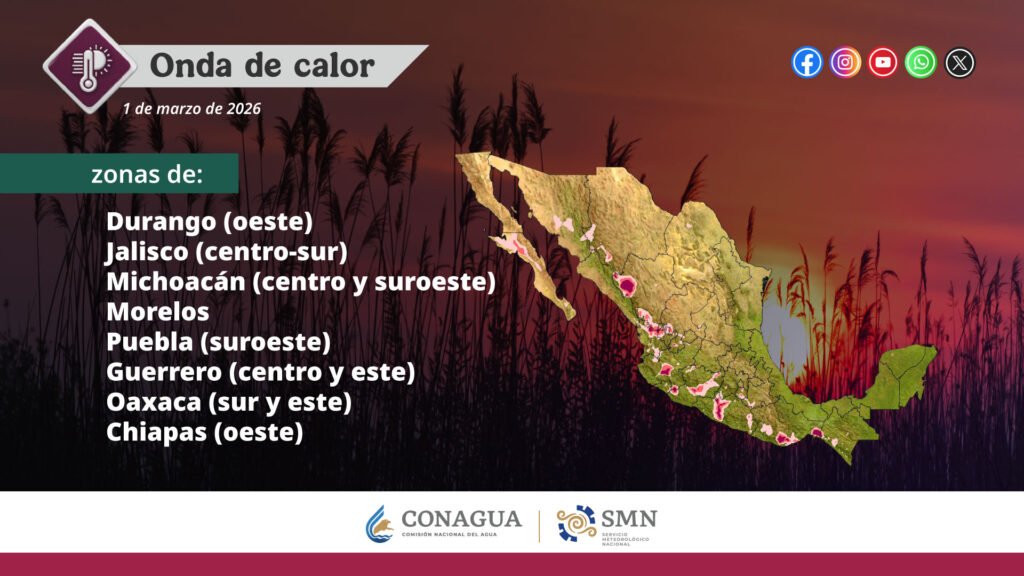 Para hoy, una circulación anticiclónica en niveles medios de la atmósfera sobre el noroeste, norte y occidente del territorio nacional, mantendrá ambiente caluroso a muy caluroso en las citadas regiones, prevaleciendo la onda de calor en Durango (oeste), Jalisco (centro-sur), Michoacán (centro y suroeste), Morelos, Puebla (suroeste), Guerrero (centro y este), Oaxaca (sur y este) y Chiapas (oeste).