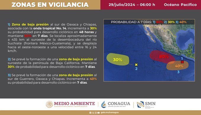 Hasta este 29 de julio, se ubica como zona de baja presión al sur de Oaxaca y Chiapas. Asociada con la onda tropical 14, mantiene una alta probabilidad para desarrollo de ciclón.