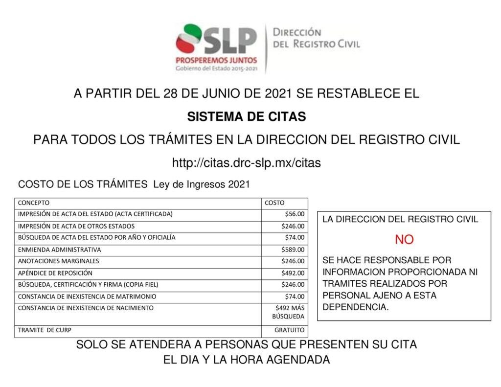 La Dirección del Registro Civil de Gobierno del Estado, reitera a la población que se reactivó el Sistema de Citas a través del portal http://citas.drc-slp.mx/citas con el objetivo de evitar una alta concentración de personas así como largas filas, en cumplimiento a los protocolos sanitarios establecidos por las autoridades de salud para evitar contagios de Covid-19.