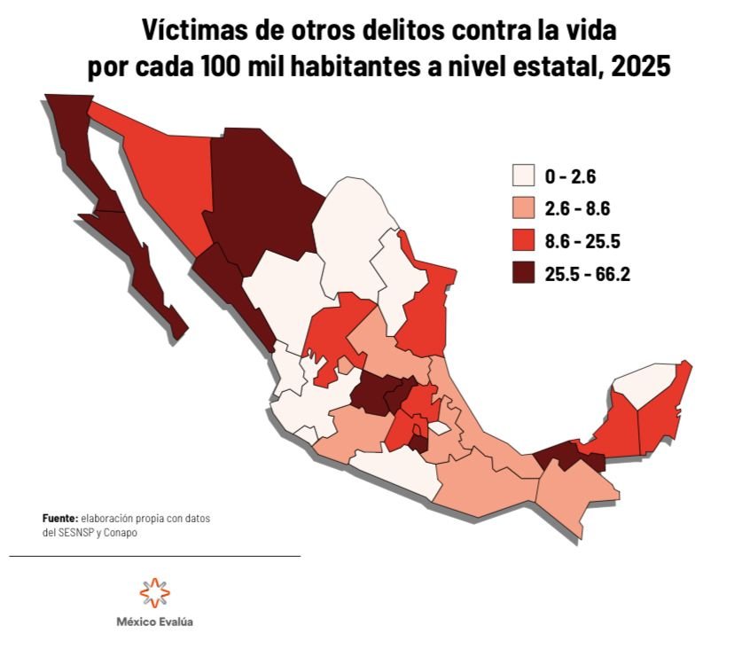 Asimismo, el informe detalla que en el rubro de otros delitos que atentan contra la vida y la integridad corporal, el estado registró una tasa de 0.8 por cada 100 mil habitantes, lo que le otorga la posición 12 en el comparativo entre entidades. Finalmente, en lo que respecta a los homicidios culposos, San Luis Potosí presentó una tasa de 1.2 por cada 100 mil habitantes, situándose en el lugar 11 de la clasificación general.