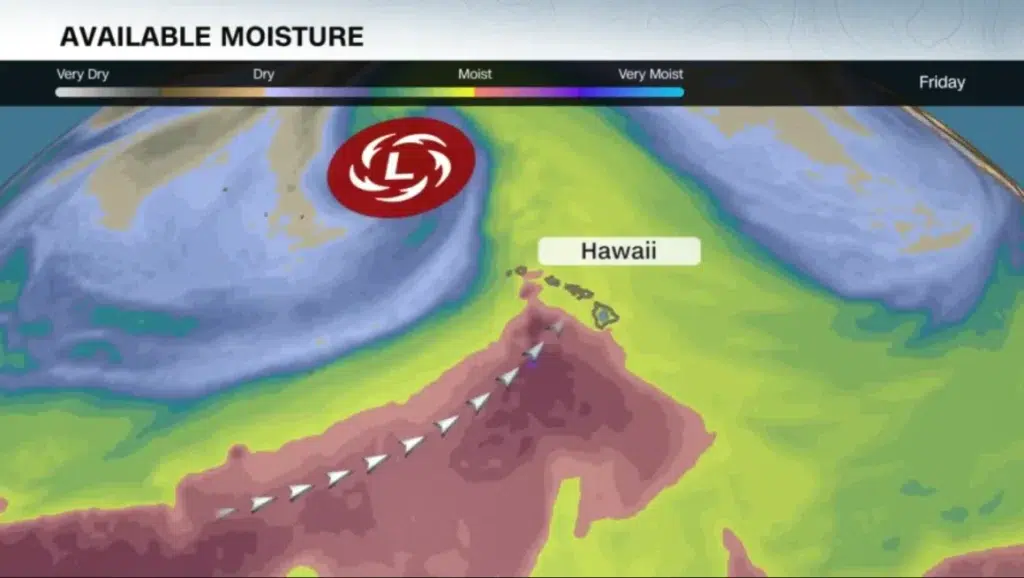 Algunos lugares podrían registrar el equivalente a varios meses de lluvia en solo unos días, por lo que hay una vigilancia de inundaciones vigente para todo Hawai hasta la tarde del viernes, advirtiendo sobre la posibilidad de inundaciones significativas y deslizamientos de tierra. Se espera que la tormenta traiga entre 4 y 8 pulgadas (10 y 20 cms) de lluvia de manera generalizada para la noche del viernes, con cantidades localmente más altas que podrían superar las 10 pulgadas (25 cms).