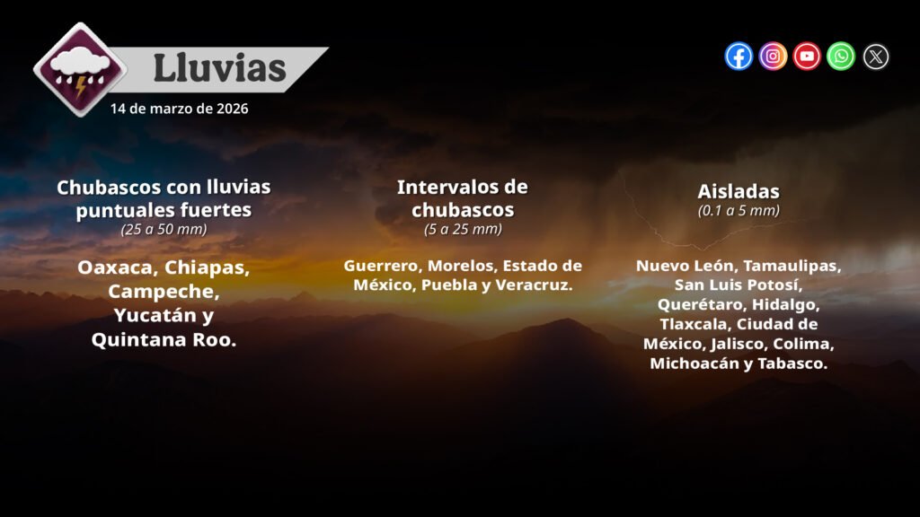 Intervalos de chubascos (5 a 25 mm): Tamaulipas, Veracruz, Puebla, Oaxaca, Chiapas, Yucatán y Quintana Roo.