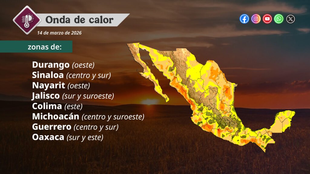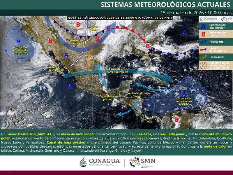 Para hoy en la tarde-noche, un nuevo frente frío (núm. 41) ingresará sobre el norte y noreste de México, interaccionará con una vaguada polar y con la corriente en chorro polar, ocasionará viento de componente norte con rachas de 70 a 90 km/h y posibles tolvaneras, durante la noche, en Chihuahua, Coahuila, Nuevo León y Tamaulipas; además de chubascos en Tamaulipas. Por otra parte, canales de baja presión extendidos sobre el oriente y sureste del país, línea seca en el noreste de México y el ingreso de humedad del océano Pacífico, golfo de México y mar Caribe, y efectos de la corriente en chorro subtropical, favorecerán lluvias y chubascos con posibles descargas eléctricas en estados del oriente, centro, sur y sureste del territorio nacional. Finalmente, continuará la onda de calor en Jalisco (sur y suroeste), Colima (este), Michoacán (centro y suroeste), Guerrero (centro y sur) y Oaxaca (sur y este), finalizando en Durango, Sinaloa y Nayarit. Se pronostica que, en las primeras horas del lunes, de inicio un evento de “Norte” intenso en el litoral de Tamaulipas, condiciones que se extenderán al resto del golfo de México, istmo y golfo de Tehuantepec.