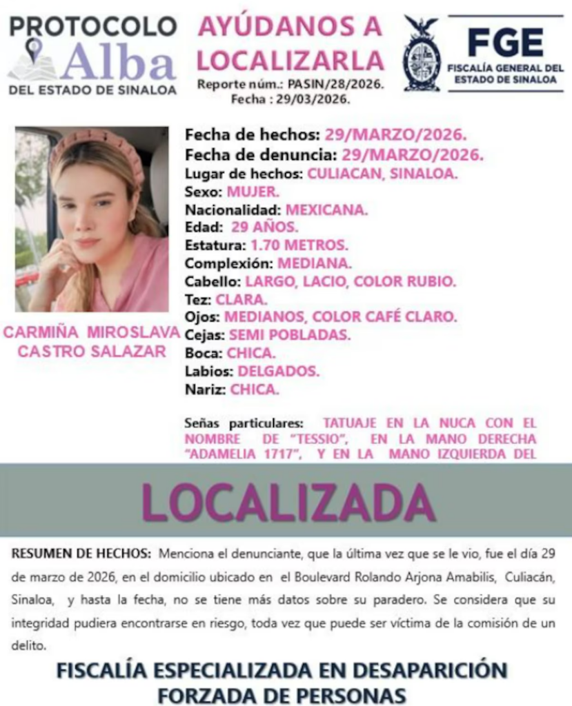 “La Físcalía agradece la colaboración ciudadana, Carmiña Miroslava Castro Salazar ya fue localizada”, menciona una publicación oficial en redes sociales; sin embargo, no se han dado detalles sobre las circunstancias en las que que se encontró ni sobre posibles responsables.