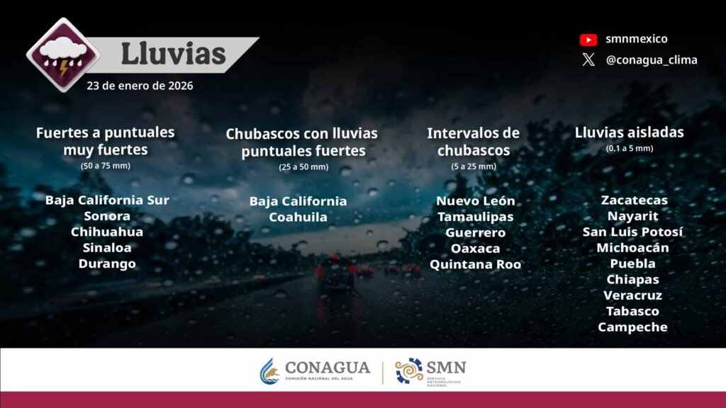 Pronóstico de lluvias para hoy 23 de enero de 2026: