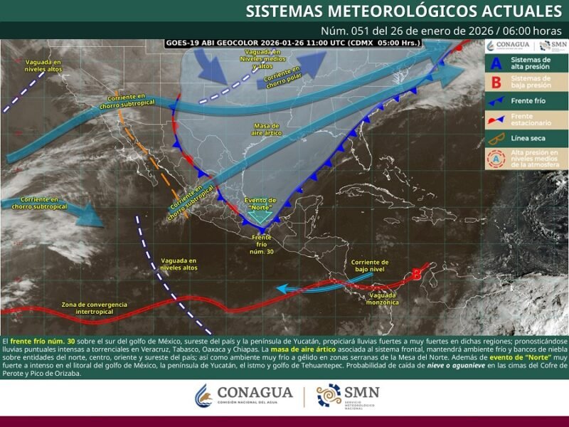 Para hoy, el frente frío núm. 30 se desplazará sobre el sur del golfo de México, sureste del país y la península de Yucatán, propiciará lluvias fuertes a muy fuertes en dichas regiones; pronosticándose lluvias puntuales intensas a torrenciales en Veracruz, Tabasco, Oaxaca y Chiapas. Simultáneamente, la masa de aire ártico asociada al sistema frontal, mantendrá el ambiente frío y bancos de niebla sobre entidades del norte, centro, oriente y sureste del país; así como ambiente muy frío a gélido en zonas serranas de la Mesa del Norte. Además de evento de “Norte” muy fuerte a intenso en el litoral del golfo de México, la península de Yucatán, istmo y golfo de Tehuantepec. A su vez, prevalecerá la probabilidad de caída de nieve o aguanieve en las cimas del Cofre de Perote y Pico de Orizaba.