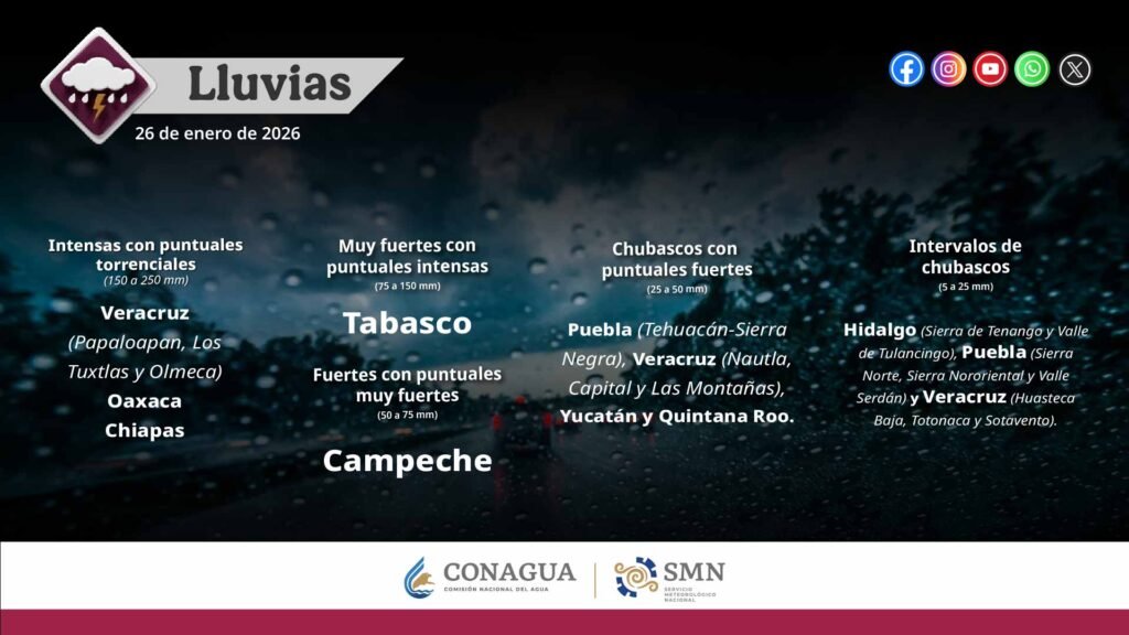 Pronóstico de lluvias para hoy 26 de enero de 2026: