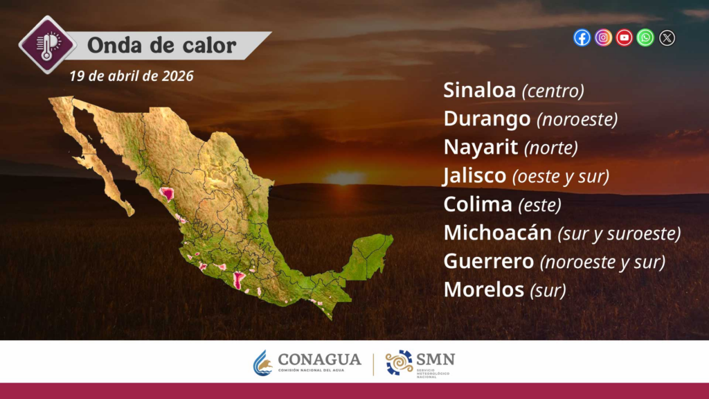 Todas acompañadas con descargas eléctricas y posible caída de granizo. Además, se pronostican intervalos de chubascos en Colima, Puebla, Tlaxcala, Hidalgo, San Luis Potosí, Aguascalientes, Zacatecas, Nuevo León, Coahuila y Chihuahua. Finalmente, una circulación anticiclónica en niveles medios de la atmósfera mantendrá la onda de calor en Durango (noroeste), Sinaloa (centro y sur), Nayarit (norte), Jalisco (oeste y sur), Colima (este), Michoacán (sur y suroeste), Guerrero (noroeste y sur) y Morelos (sur), dando inicio a partir de hoy en Oaxaca (suroeste).