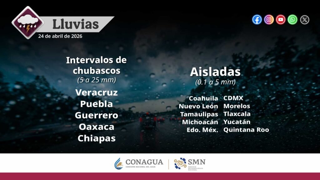 Pronóstico de lluvias para hoy 24 de abril de 2026: