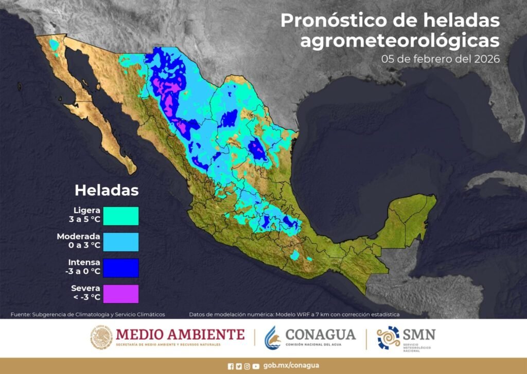 Temperaturas mínimas de -5 a 0 °C con heladas durante la madrugada del jueves: zonas serranas de Baja California, Coahuila, Nuevo León, Zacatecas, Michoacán, Guanajuato, Querétaro, Hidalgo, Estado de México, Tlaxcala, Puebla, Veracruz y Oaxaca.