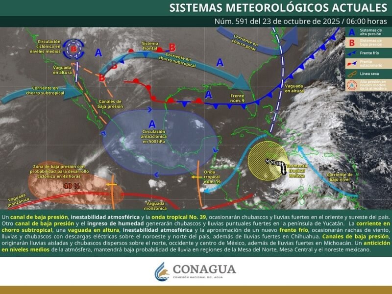 Este día, un canal de baja presión sobre el oriente y sureste del país, inestabilidad atmosférica y la onda tropical No. 39 al sur de Chiapas, ocasionarán chubascos y lluvias fuertes en dichas regiones. A su vez, otro canal de baja presión y el ingreso de humedad procedente del mar Caribe y golfo de México generarán chubascos y lluvias puntuales fuertes en la península de Yucatán. Por otra parte, la corriente en chorro subtropical y una vaguada en altura sobre el noroeste y norte del país, en interacción con inestabilidad atmosférica y la aproximación de un nuevo frente frío a la frontera norte de México, ocasionarán rachas de viento, lluvias y chubascos con descargas eléctricas en las regiones mencionadas, además de lluvias puntuales fuertes en Chihuahua. Así mismo, canales de baja presión sobre el interior del país, originarán lluvias aisladas y chubascos dispersos en estados del norte, occidente y centro de México, además de lluvias puntuales fuertes en Michoacán. Un anticiclón en niveles medios de la atmósfera sobre la mayor parte del territorio nacional, mantendrá baja probabilidad de lluvia en regiones de la Mesa del Norte, Mesa Central y el noreste mexicano.