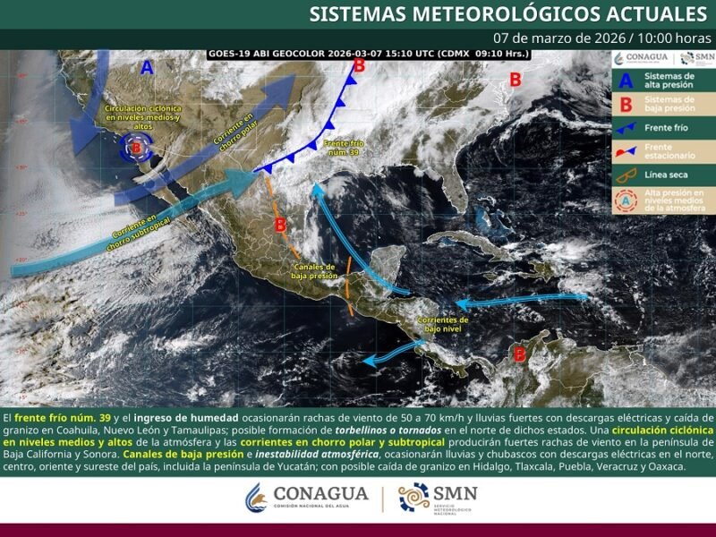 Para hoy, se prevé que el frente núm. 39 se extenderá sobre el norte del país, en interacción con una línea seca sobre el norte de Coahuila y un canal de baja presión sobre el noreste de México, ocasionarán lluvias puntuales fuertes acompañadas con descargas eléctricas, posible caída de granizo y rachas de viento de 50 a 70 km/h en Coahuila, Nuevo León y Tamaulipas, asimismo, se prevén condiciones para la posible formación de torbellinos o tornados en el norte de dichos estados. Además, se mantiene el viento de componente sur (surada) en el litoral del golfo de México. Por otra parte, una circulación ciclónica en niveles medios y altos de la atmósfera sobre el noroeste de México, en interacción con las corrientes en chorro polar y subtropical, mantendrán ambiente frío por la mañana, y gélido en sierras de Chihuahua y Durango, vientos con rachas fuertes y lluvias aisladas en la región mencionada; a partir de la tarde, existirán condiciones para la caída de nieve o aguanieve en las sierras de Baja California. Por otro lado, canales de baja presión en el oriente y sureste del territorio nacional, inestabilidad atmosférica y el ingreso de humedad del océano Pacífico, golfo de México y mar Caribe, favorecerán intervalos de chubascos en dichas regiones, incluyendo la península de Yucatán. Finalmente, prevalecerá la onda de calor en Colima (este), Michoacán (centro y suroeste), Guerrero (centro y sur), Oaxaca (sur y este) y Chiapas (oeste).