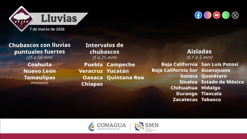 Pronóstico de lluvias para hoy 07 de marzo de 2026: