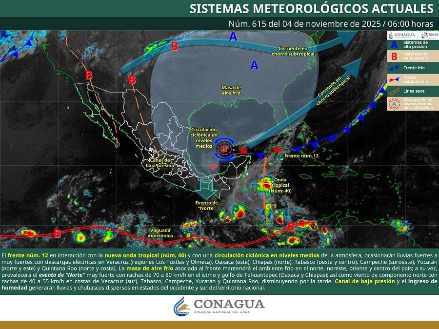 Para hoy, el frente núm. 12 se extenderá con características de estacionario sobre la península de Yucatán y la Sonda de Campeche, interaccionará con la nueva onda tropical (núm. 40) que se aproximará a Quintana Roo y con una circulación ciclónica en niveles medios de la atmósfera sobre el golfo de México, ocasionando lluvias fuertes a muy fuertes con descargas eléctricas en Veracruz (regiones Los Tuxtlas y Olmeca), Oaxaca (este), Chiapas (norte), Tabasco (oeste y centro), Campeche (suroeste), Yucatán (norte y este) y Quintana Roo (norte y costa). La masa de aire frío asociada al frente núm. 12 mantendrá el ambiente frío en el norte, noreste, oriente y centro del país, con bancos de niebla y heladas al amanecer en estados de la Mesa del Norte y la Mesa Central; a su vez, prevalecerá el evento de “Norte” muy fuerte con rachas de 70 a 80 km/h en el istmo y golfo de Tehuantepec (Oaxaca y Chiapas); así como viento de componente norte con rachas de 40 a 55 km/h en costas de Veracruz (sur), Tabasco, Campeche, Yucatán y Quintana Roo, disminuyendo por la tarde. Por otra parte, un canal de baja presión y el ingreso de humedad del océano Pacífico y golfo de México, ocasionarán lluvias y chubascos dispersos en estados del occidente y sur del territorio nacional. Finalmente, se mantendrá baja probabilidad de lluvia en el noroeste, norte, noreste y centro de México.