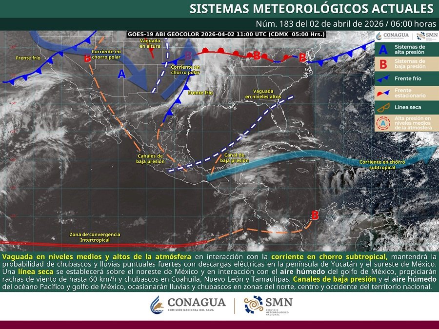 Para hoy, una vaguada en niveles altos de la atmósfera se desplazará gradualmente sobre la península de Yucatán y el mar Caribe, en interacción con la corriente en chorro subtropical, mantendrá la probabilidad de chubascos y lluvias puntuales fuertes con descargas eléctricas en dicha península, además del sureste de México. A su vez, por la tarde se establecerá una línea seca en el norte del país en interacción con la entrada de humedad del golfo de México, propiciarán rachas de viento de hasta 60 km/h y chubascos en Coahuila, Nuevo León y Tamaulipas. Simultáneamente, canales de baja presión en el interior del país y el ingreso de humedad del océano Pacífico y golfo de México, propiciarán lluvias y chubascos en zonas del norte, centro y occidente del territorio nacional. Finalmente, continuará la onda de calor en zonas de Jalisco (centro, sur y suroeste), Michoacán (centro y oeste), Guerrero (noroeste, centro y sur) y Oaxaca (centro, este y sureste).