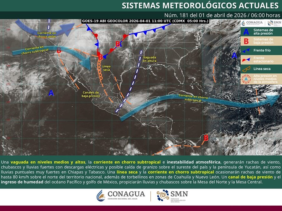 Este día, una vaguada en niveles medios y altos de la atmósfera se desplazará sobre el sureste del país y la península de Yucatán, interaccionará con la corriente en chorro subtropical y con inestabilidad atmosférica, generando rachas de viento, chubascos y lluvias fuertes con descargas eléctricas y posible caída de granizo en dichas regiones, así como lluvias puntuales muy fuertes en Chiapas y Tabasco. Por otra parte, una línea seca sobre el norte del territorio nacional, en combinación con la corriente en chorro subtropical ocasionarán rachas de viento de hasta 80 km/h en la mencionada región, además de condiciones para formación de torbellinos en zonas de Coahuila y Nuevo León. Finalmente, un canal de baja presión extendidos sobre la Mesa del Norte y la Mesa Central, aunado al ingreso de humedad del océano Pacífico y golfo de México, propiciarán lluvias y chubascos en ambas regiones.