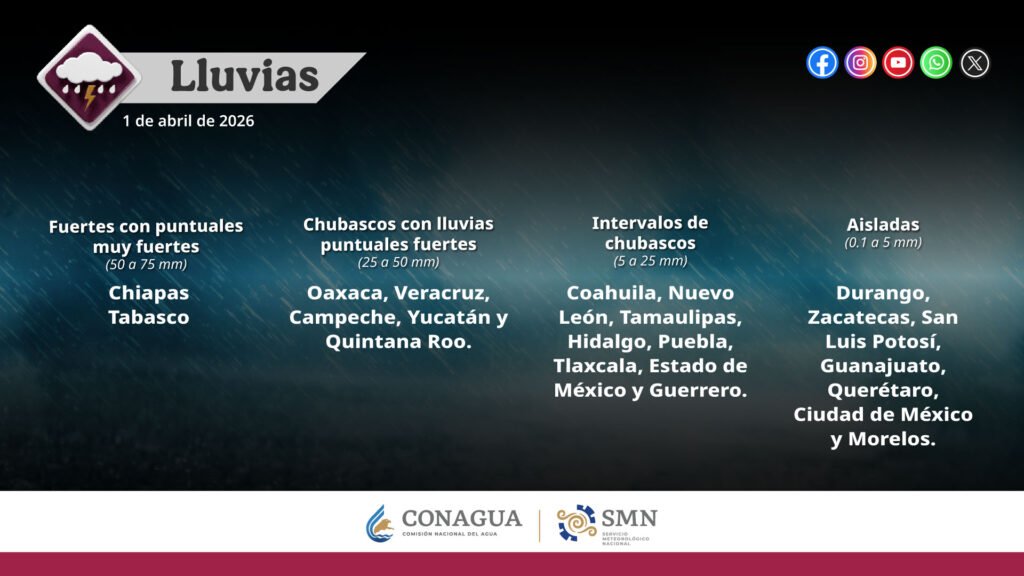 Pronóstico de lluvias para hoy 01 de abril de 2026: