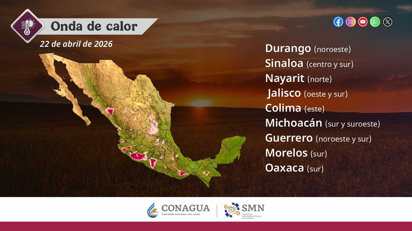 Para hoy, canales de baja presión sobre la Mesa del Norte, la Mesa Central y el sureste del país, así como inestabilidad atmosférica en altura e ingreso de aire húmedo del océano Pacífico y golfo de México originarán lluvias puntuales fuertes en Oaxaca, Guerrero, Puebla, Morelos y Estado de México; intervalos de chubascos en Michoacán, Veracruz, Tamaulipas, Tlaxcala, Ciudad de México, Hidalgo, Querétaro, Nuevo León y Coahuila. La entrada de aire húmedo proveniente del mar Caribe, ocasionará lluvias puntuales fuertes en Chiapas; y lluvias aisladas en zonas de Quintana Roo, Yucatán, Campeche y Tabasco. Por su parte, el nuevo frente frío Núm. 46 ingresará y recorrerá el noroeste de México, generando vientos con rachas de 40 a 60 km/h en Baja California Sur, Chihuahua y Durango, acompañados con lluvias aisladas en zonas de Baja California y Sonora. Asimismo, continuará la circulación anticiclónica en niveles medios de la atmósfera manteniendo la onda de calor en Durango (noroeste), Sinaloa (centro y sur), Nayarit (norte), Jalisco (oeste y sur), Colima (este), Michoacán (sur y suroeste), Guerrero (noroeste y sur), Morelos (sur) y Oaxaca (sur). Finalmente, se mantendrá el mar de fondo con oleaje de 1.0 a 2.0 metros de altura en las costas de Jalisco, Colima, Michoacán, Guerrero, Oaxaca y Chiapas, condiciones que disminuirán durante la tarde.
