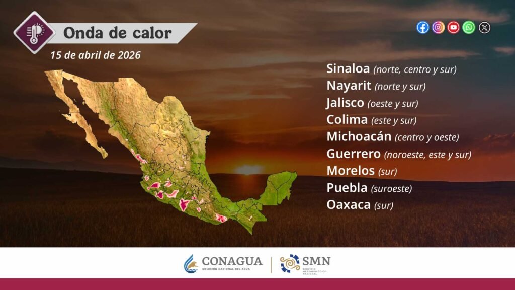 Para hoy, una línea seca que se extenderá sobre el noreste de la República Mexicana en interacción con la corriente en chorro subtropical, ocasionarán intervalos de chubascos con descargas eléctricas en Coahuila; y lluvias aisladas en zonas de Nuevo León, Tamaulipas, Zacatecas y San Luis Potosí. A su vez, se prevén rachas de viento de 50 a 70 km/h en Baja California, Sonora, Chihuahua, Durango y Tamaulipas; y rachas de 40 a 60 km/h en Baja California Sur, Sinaloa, Coahuila, Nuevo León, Zacatecas, San Luis Potosí y Aguascalientes. Por otra parte, canales de baja presión en el interior del país y el ingreso de aire húmedo del océano Pacífico, golfo de México y mar Caribe, generarán lluvias puntuales fuertes en Chiapas; y lluvias con chubascos en Oaxaca, las cuales se acompañarán con posibles descargas eléctricas; asimismo, se prevén lluvias aisladas en zonas de los estados del occidente, centro y sureste del territorio nacional, además de la península de Yucatán. Finalmente, se mantendrá la onda de calor en zonas de Sinaloa (centro y sur), Nayarit (norte y sur), Jalisco (oeste y sur), Colima (este), Michoacán (centro y oeste), Morelos (sur), Puebla (suroeste), Guerrero (noroeste, este y sur) y Oaxaca (sur). Se pronostica mar de fondo con oleaje de 2.0 a 3.0 metros de altura en costas de Jalisco, Colima, Michoacán, Guerrero, Oaxaca y Chiapas; además de oleaje de 1.0 a 2.0 metros de altura en la costa occidental de Baja california y Baja California Sur, y en costas de Tamaulipas, Veracruz, Tabasco, Campeche, Yucatán y Quintana Roo.