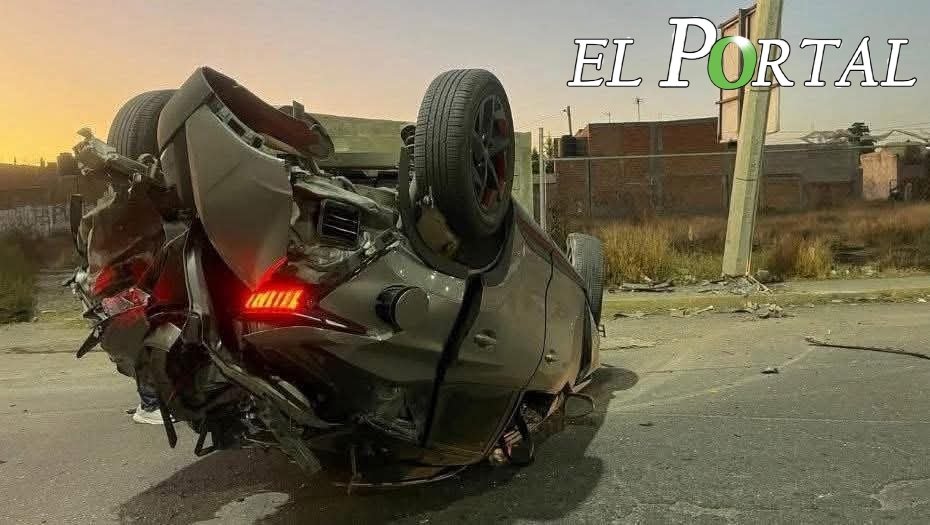 San Luis Potosí, S.L.P. (El Portal). – La mañana de este viernes, una camioneta color plateado oscuro volcó en la intersección de Circuito Potosí y avenida del Sauce, quedando con las llantas hacia arriba.