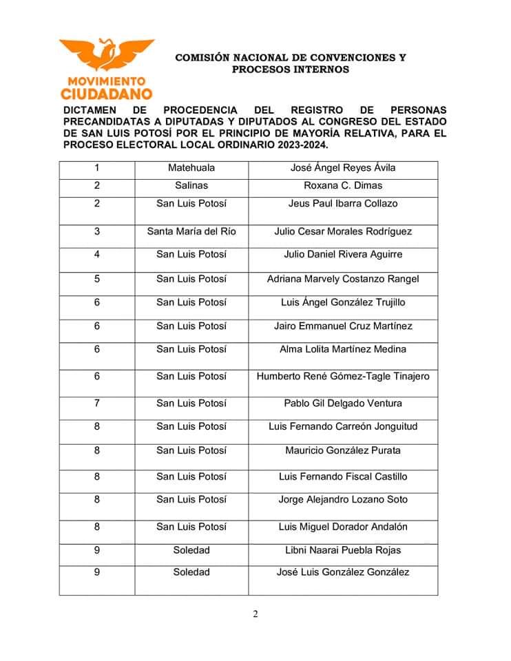 Este día se dio a conocer por parte de la comisión nacional de convenciones y procesos internos del movimiento ciudadano el dictamen que procede de registro de personas precandidatos a diputadas y diputados del congreso del estado por San Luis Potosí por el principio de mayoría relativa para el proceso local ordinario 2023 2024.