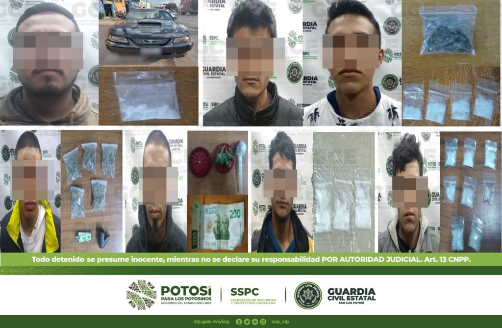 Al interior del Estado, tres hombres fueron detenidos: uno de ellos en la colonia 12 de Octubre perteneciente al municipio de Matlapla, tratándose de Samuel de 23 años de edad a quien le aseguraron cuatro bolsas con marihuana; en Ciudad Valles, en el fraccionamiento Rosas del Tepeyac, fue detenido Leonardo de 22 años con cuatro dosis de marihuana; en el municipio de Rioverde en la colonia La Victoria, fue detenido Juan de 18 años con cuatro dosis de “cristal”.