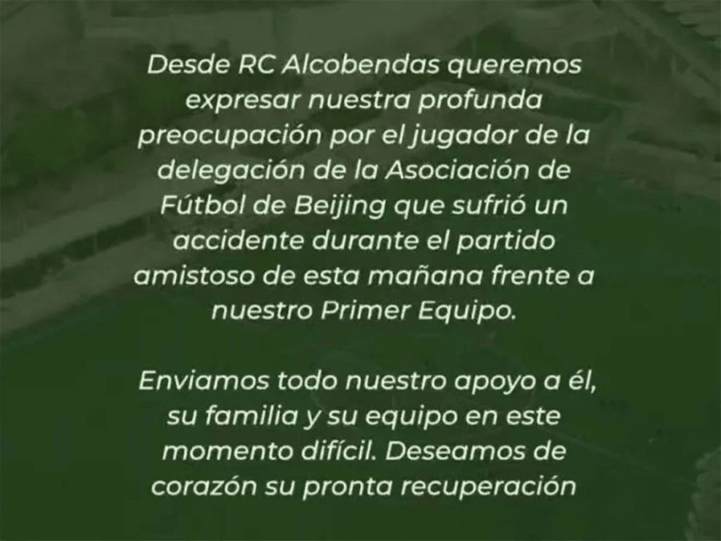 El RC Alcobendas expresó su “preocupación por el jugador de la delegación de la Asociación de Fútbol de Pekín que sufrió un accidente durante un partido amistoso contra nuestro primer equipo”.