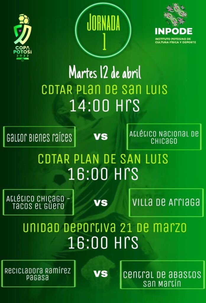 La Copa Potosí será un excelente espectáculo futbolístico, tanto en la rama varonil como en la femenil, ya que participarán exjugadores profesionales de calidad comprobada. Los escenarios de esta justa deportiva son el “Plan de San Luis”, la Unidad Deportiva “Adolfo López Mateos” y la Unidad Deportiva “21 de Marzo” en la colonia San Antonio del municipio de Soledad de Graciano Sánchez. La gran final en rama varonil y femenil será en el Estadio “Alfonso Lastras Ramírez” desde las 12:00 horas del próximo domingo 17 de abril.